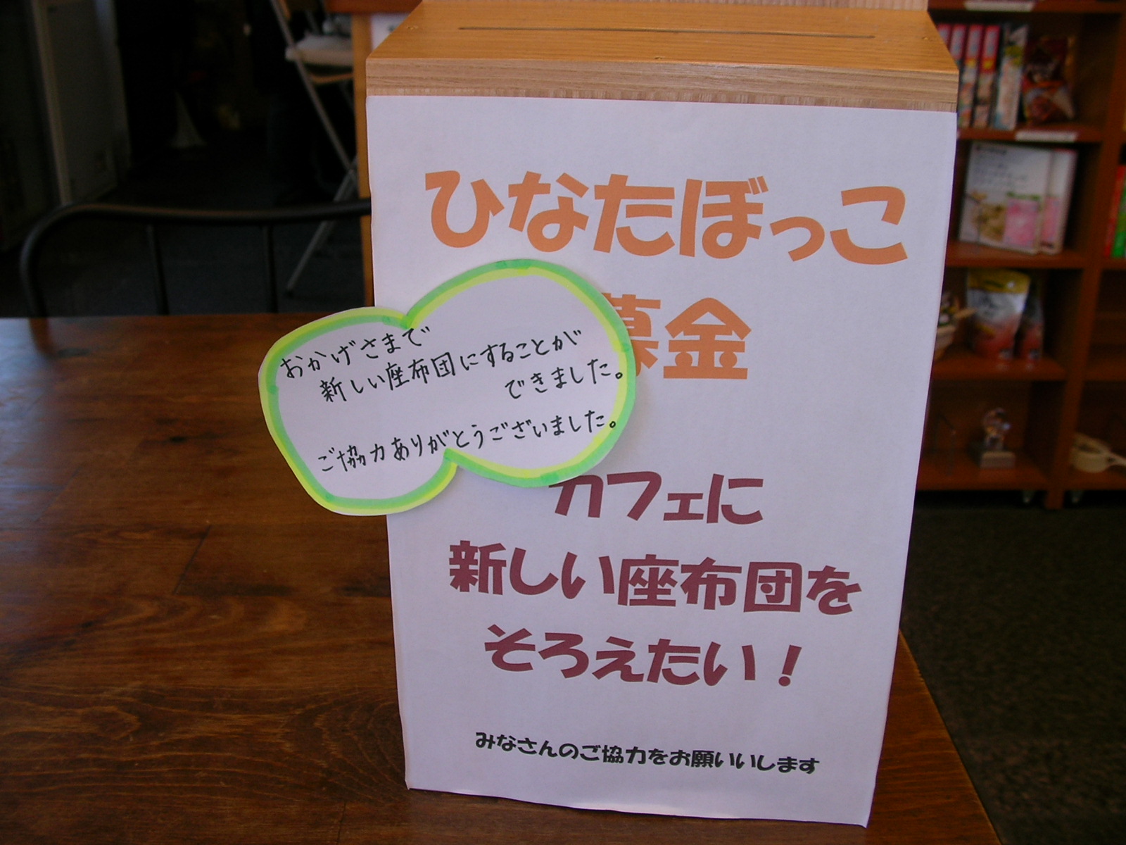 ひなたぼっこ募金で新しい座布団がそろいました! 2012年1月17日 最終更新日時 : 2012年1月17日 econetaono 2011年に設置した「ひなたぼっこ募金箱」。 皆さまに、「新しい座布団をそろえたい!」というお願いをしてまいりました。 おかげさまで、11,397円が集まり、新年に新しい座布団をそろえることができました。 ご協力下さった皆さま、本当にありがとうございました! すっきりとした店内でお客さまをお迎えしておりますので、ぜひお立ち寄り下さいませ。