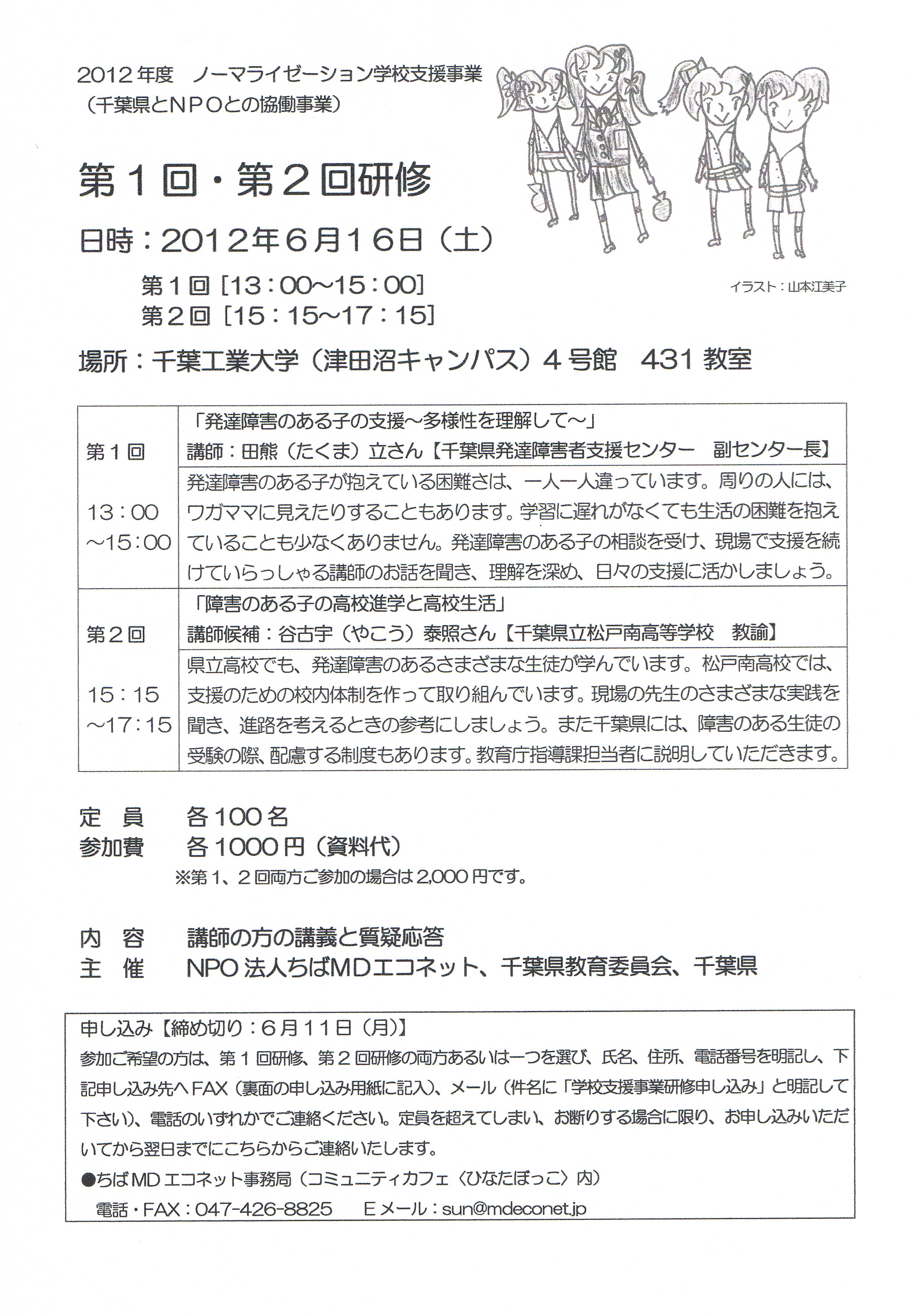 参加ご希望の方は、第1回研修、第2回研修の両方あるいは一つを選び、氏名、住所、電話番号を明記し、下記申し込み先へFAX(裏面の申し込み用紙に記入)、メール(件名に「学校支援事業研修申し込み」と明記して下さい)、電話のいずれかでご連絡ください。定員を超えてしまい、お断りする場合に限り、お申し込みいただいてから翌日までにこちらからご連絡いたします。