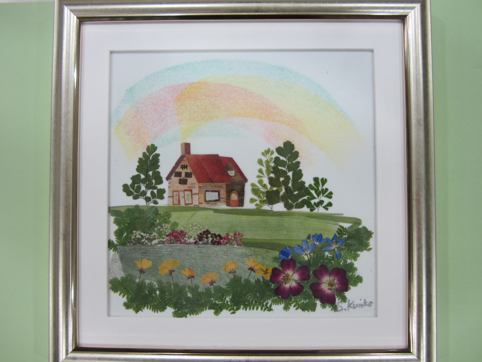 3年後、インストラクターの資格を取得。「押し花の魅力をみんなに知ってほしい。」という想いから、船橋市宮本公民館で作品展を開き、押し花サークルが立ち上がりました。初めは3人だけの小さなサークルで、押し花は初めての方々ばかりでした。花の押し方から始めて、箸袋、ろうそく等の小物から作りはじめました。その後、素晴らしい押し花の絵を作れるようになった頃には、会員も増えてきました。