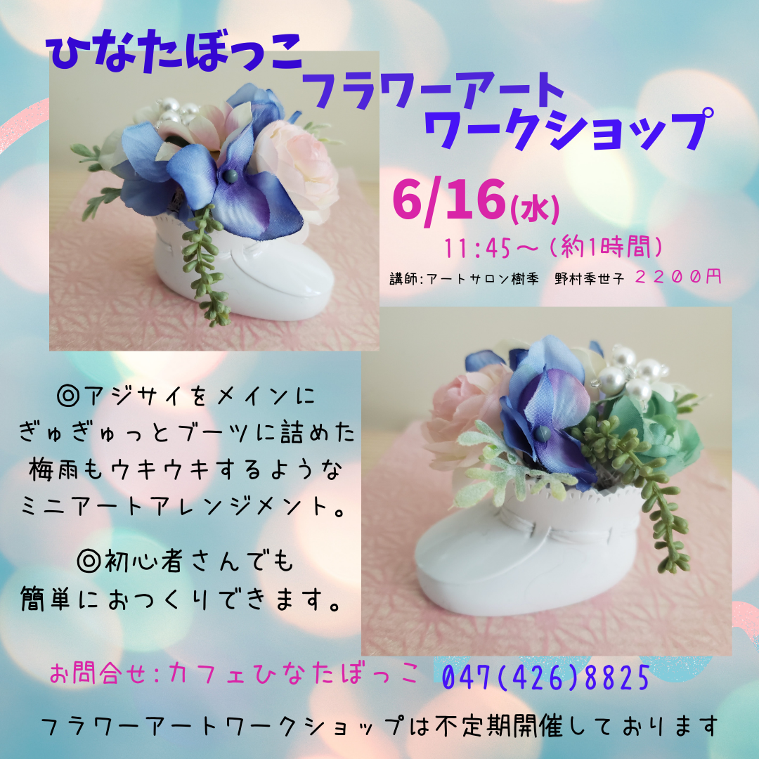 6月16・26日 フラワーアートワークショップ【終了】 2021年5月27日 最終更新日時 : 2021年5月27日 econetaono 6月16日(水) 11:45〜(約1時間) 6月26日(土) 14:00〜(約1時間) ※26日も追加になりました【2021.6.4更新】 講師:アートサロン樹季 野村季世子 料金:2,200円 ◎アジサイをメインに、ぎゅぎゅっとブーツに詰めた 梅雨もウキウキするようなミニアートアレンジメント。 ◎初心者さんでも簡単におつくりできます。 お問い合わせ:コミュニティカフェひなたぼっこ 047-426-8825 * フラワーアートワークショップは不定期開催しております。