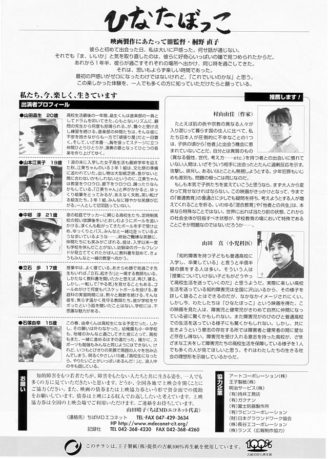 「知的障害を持つ子どもも普通学校に入学し、卒業している」と言うと半信半疑の顔をする人は多い。そういう人は「授業についていけない子どもがどうやって高校生活を送っていくのだ」と思うようだ。実際に楽しい高校生活を送っている知的障害児は全国に沢山いるから、その様子を詳しく語ることはできるのだが、なかなかイメージされにくい。しかし今、わたしたちは「ひなたぼっこ」という映画を得た。この映画を見た人は、障害児と健常児がきわめて自然に仲間になっている姿に驚くかもしれない。また障害児がのびのびと普通高校での生活を送っている様子にも驚くかもしれない。しかし、共に生きようという意志の存在する所では障害者と健常者の間に壁など存在し得ない。障害児を受け入れる意志を持った高校が、さまざまな工夫をして障害児たちの高校生活を保障している様子を1人でも多くの人が見てほしいと思う。それはわたしたちの生きる社会の理想形を示唆しているからだ。