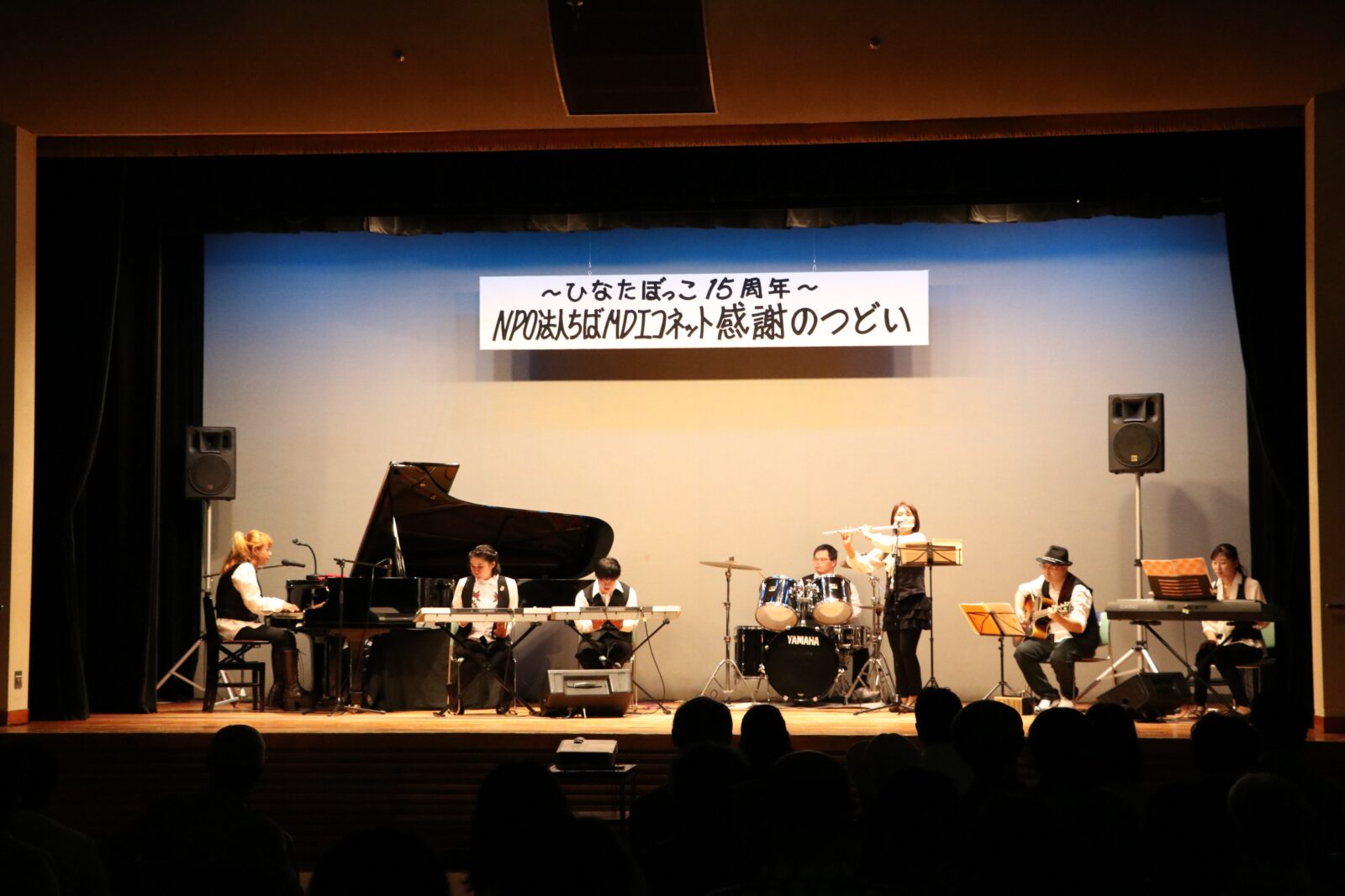 2017年9月2日に開催した、「ひなたぼっこ15周年感謝のつどい」では、船橋市中央公民館講堂で演奏を披露。280人近い観客の前で演奏することができました。